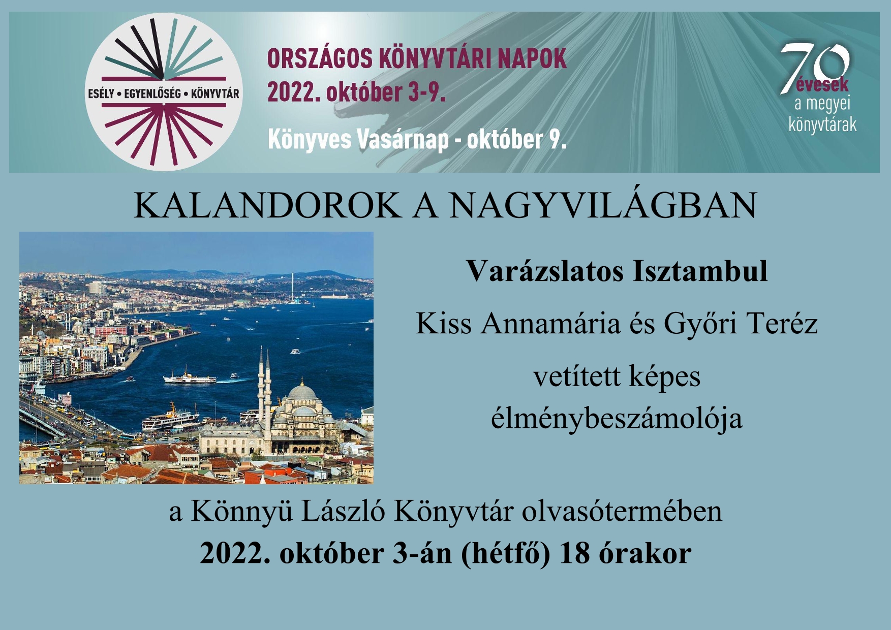 A 2022. év eseményeinek tervezésekor kiemelten figyeltünk arra a tényre, hogy országszerte 70. születésnapjukat ünneplik a megyei könyvtárak. 1952-ben egy minisztertanácsi határozat rendelkezett a megyei könyvtárak létrehozásáról, amely elsőként Békéscsabán jött létre, majd a többségük októberben. Szeretnénk az idei Országos Könyvtári Napok alatt emlékezni erre a fontos lépésre, és sokféleképpen felidézni az azóta megtett utat.
