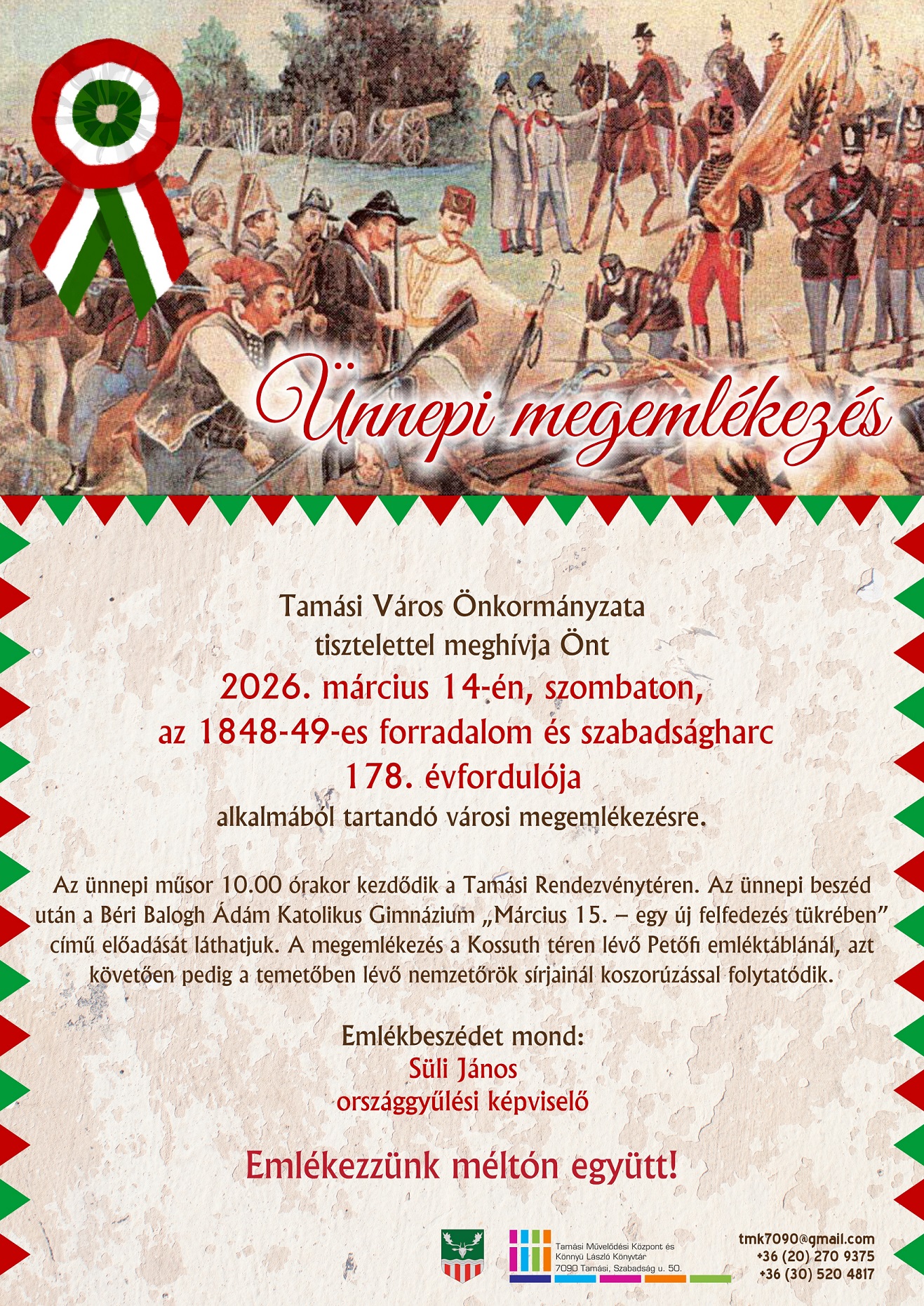 2026. március 14-én, a városi ünnepség valamennyi helyszínén. Az ünnepi megemlékezés a művelődési központ előtti rendezvénytéren kezdődik 10.00 órakor, majd a Kossuth téri Petőfi emléktáblánál folytatódik és a temetőben, a honvéd hősök sírjainál zárul.